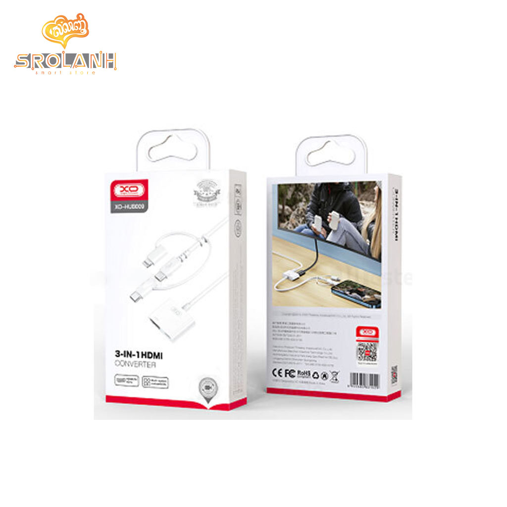 ជាប្រភេទ HUB 3 in 1 Type-C, Micro, Lightning to HDMI របស់ XO សម្រាប់ Share រូបភាពពីទូរស័ព្ទទៅទូរទស្សន៍, Projector មានកម្រិតរូបភាព 2K និងខ្សែមានប្រវែង 0.15M។